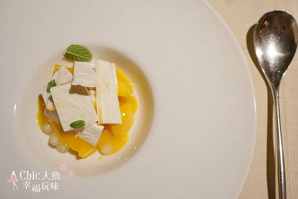 <Grand dessert>主甜點:完熟芒果冷湯珍珠.杏仁牛奶冰淇淋