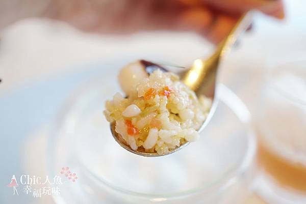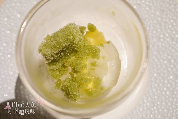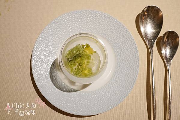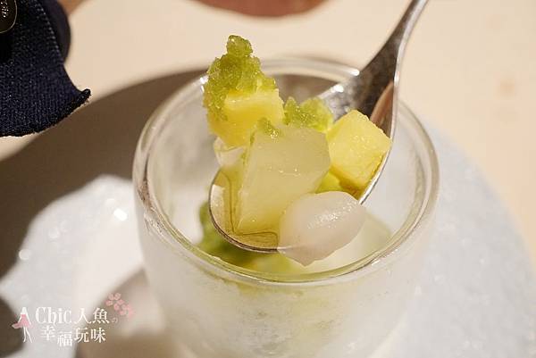 這道前甜點,以餐廳花園中栽種的羅勒搭荔枝製成Granite’(冰沙),裡頭還放進了鳳梨、冬瓜丁及荔枝。