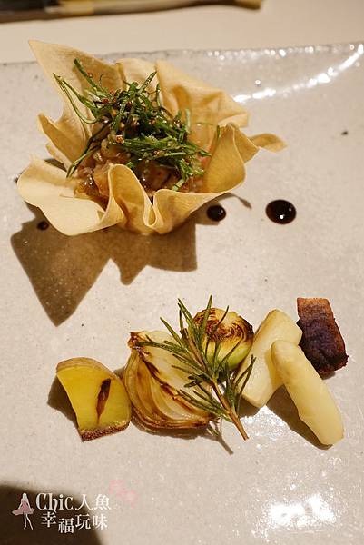 上頭還躺著一朵塩漬水晶蛋黃,口感綿密醇濃如溫泉半熟蛋,卻冒出如台灣鹹蛋黃的鹹香,又比其多了上段高級感。和著很men的雙肉塔塔一塊兒嚐,多了一份似水柔情在口中纏綿。更別提那魚子醬有多麼的神來一筆了!而底襯以地元醋微漬的紅洋蔥末,帶點兒嗆的酸氣恰如其分的中和了以上的濃情蜜意。加上鮪魚及黑毛和牛塔塔的煙燻香氣、還有水晶蛋黃的鹹香,五味一體,平衡出在口腔內迴盪不去的一記超完美之味!在前幾道味道由淡漸濃的舖陳下,由此道菜轉進副歌,開始高潮迭起。真的將整餐餐點的Tempo掌握近乎完美!