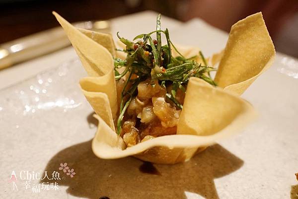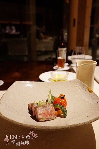 這道料理一出,掀起了第一波高潮!中洲料理長神來之筆,將竹富島近海捕捉到的鮪魚,跟煙燻黑毛和牛配成一對做成塔塔!任誰也料想不到在深海中以200km時速疾游的鮪魚,竟可跟煙燻黑毛和牛變成才子佳人!兩者之味,竟是如此契合。彷彿牛郎織女終於見著面!