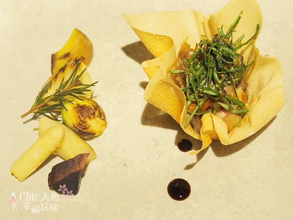 Pasty的部份:則以類炸春捲皮的方式呈現,裡頭包著豬腳、豬耳朵、豬肩肉,一次可享用到三種AGU黑豬肉的風味,佐盤旁的烤夏季島蔬菜,一派沖繩味!心、口,都南國了起來!