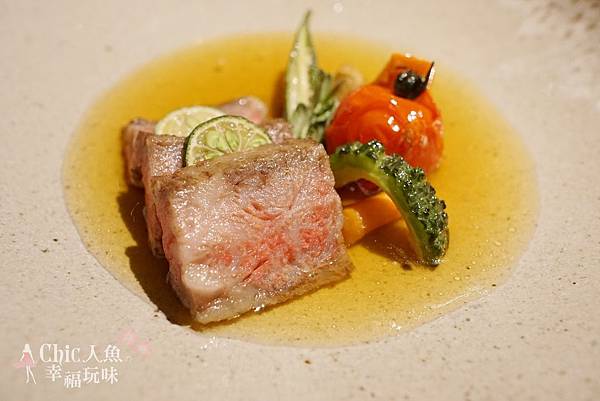 在享用前請先淋上熱熱的法式黃金清澄湯,濃縮成菁華的黃金湯液,與黑毛和牛豐厚的油脂在遞呈完美的平衡。一派高雅。加上夾在黑毛和牛之間金桔片(外來語シークヮーサー(Citrus depressa)日語稱ヒラミレモン(平実檸檬):分佈在台灣、琉球及關島。客家語稱為山桔仔,閩南語稱之為酸桔仔。)及一旁的沖繩名物-沖繩苦瓜及秋葵。這是道"沖繩意向"。中洲料理長手中的美味沖繩意向!