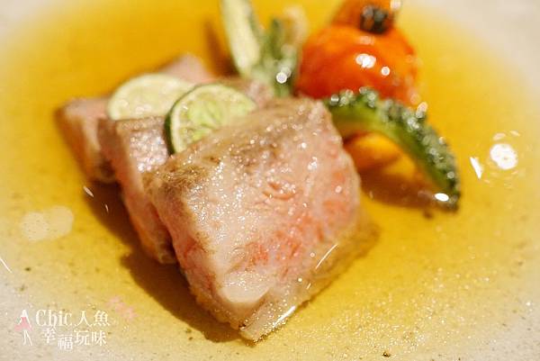 低溫油封方式處理石斑魚,以竹富島的雙色島蘿蔔在魚肉上拼成了魚鱗狀。一旁佐以Béarnaise Sauce貝亞恩醬(法國名廚Chef Collinet於西元1836年為一家巴黎郊外的亨利四世餐廳開幕所研發出的醬汁。醬汁口感綿密,充滿乳香)及竹富島香草及柑橘調製的風味醬汁,是清爽卻充滿大人成熟味的一品!