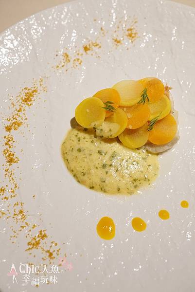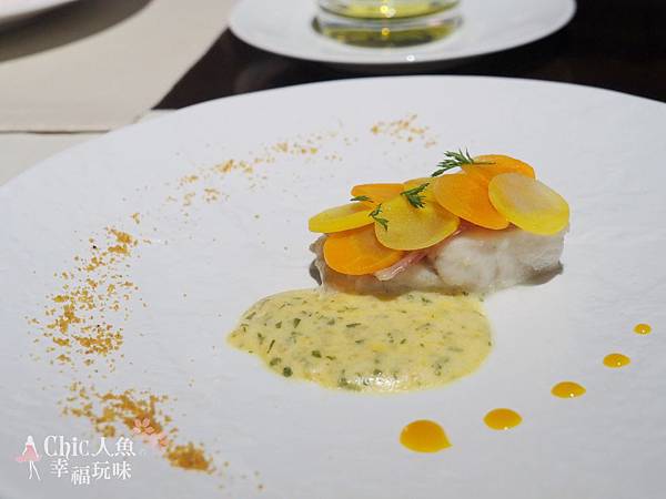 <Poisson>海鮮:油封石斑魚.雙色島人參(蘿蔔)佐法式貝亞恩柑橘醬