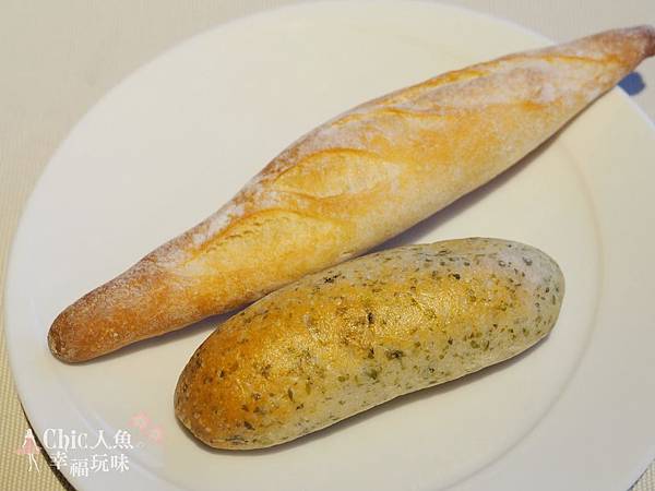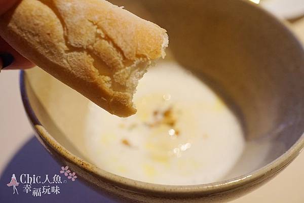 是不是很酷?這位中洲料理長!他傾聽到客樣(如我們)的心聲了!直到上完兩道冷熱前菜之後,才開始遞上佐餐麵包。這樣的節奏,令我十分讚賞!總是覺得義法料理早早就上的”餐前麵包”,總是喧賓奪主的佔去了我們的胃納空間,往往遇到美味的烘焙麵包更一發不可收拾,實在有些對不住辛苦在廚房內展演盤飧內精彩的chef們,實在可惜了chef在前菜、湯品、主菜上投置的精彩,畢竟我們的胃,坪數就這麼小小一間(笑)。So,這裡的佐餐麵包,是擺在中場前段登場的。您亦可掰開來蘸著接下來一起端上的湯品享用。當然,也可以直接爽快撕開,任由沖繩的潮香在口中襲來!